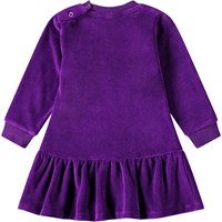 Purple velour dress for the smallest, made from a soft cotton blend. The dress has a round neckline and long sleeves with ribbed cuffs. There are poppers on one shoulder and a small skirt at the bottom.