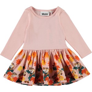 Candi is a baby dress in a two part look with look sleeves. The top is in a pink rib quality, and the skirt is in a squirrel print and golden leaves.