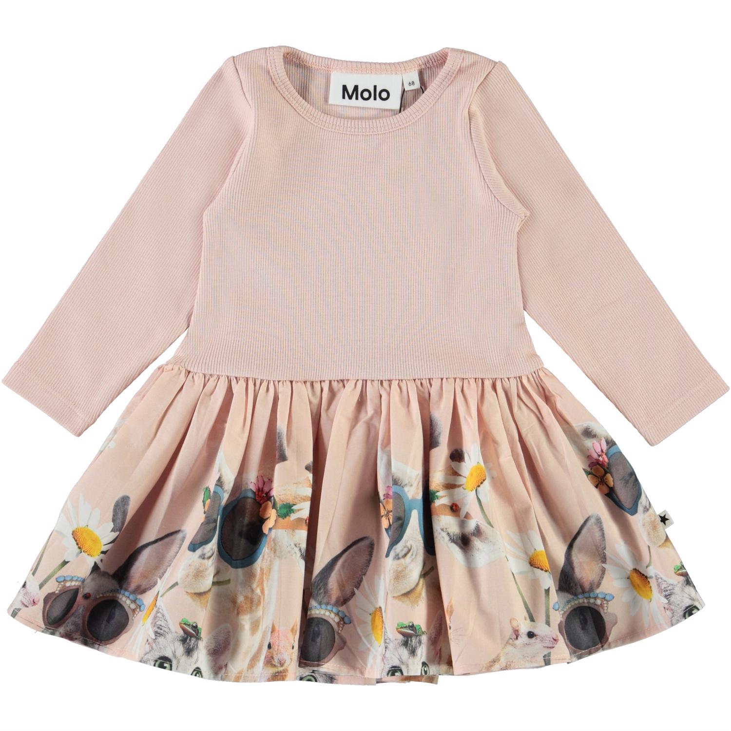 Candi is a pink baby dress. The top of the dress is in rib with long sleeves, and the skirt is in a print of various animals.