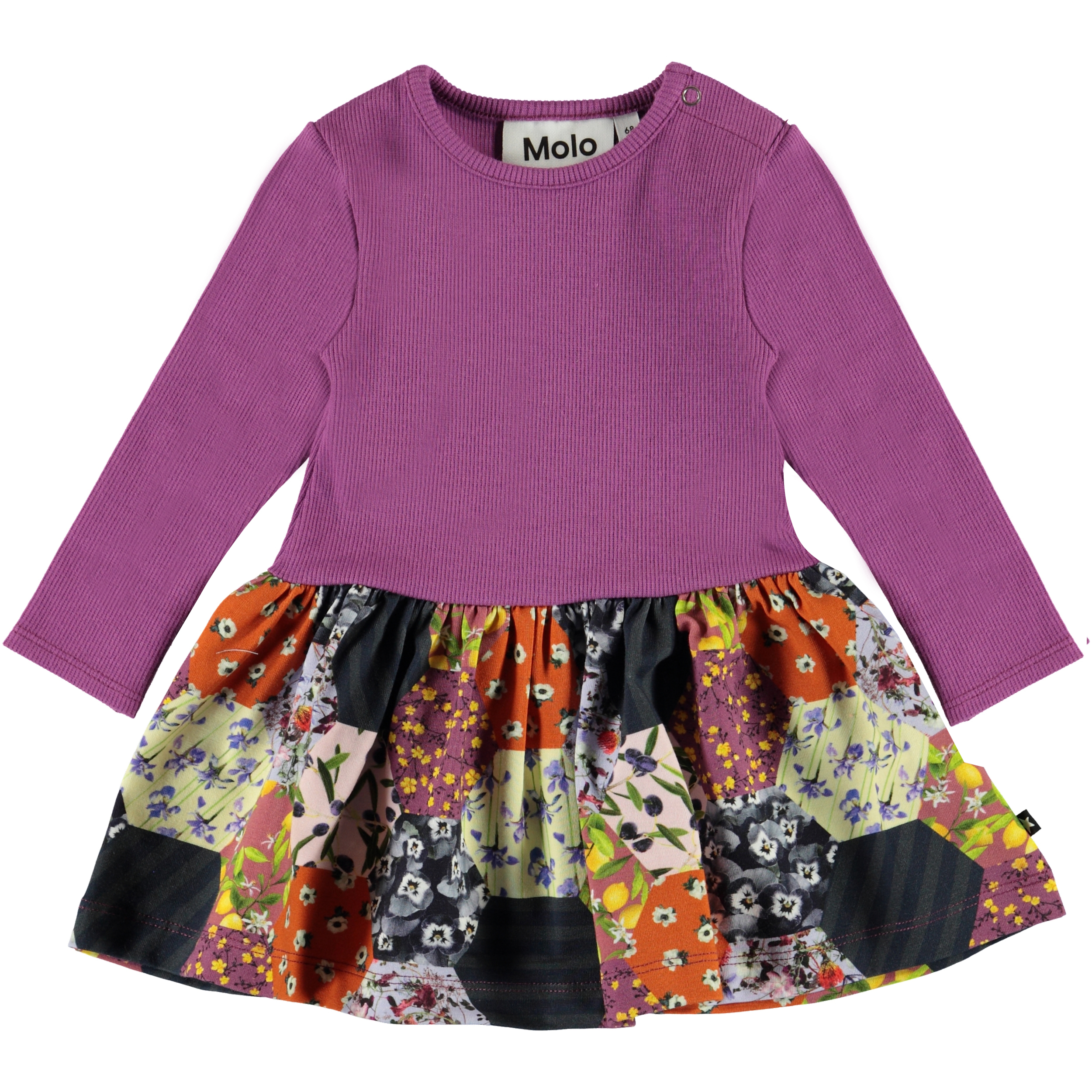 Carel is a long sleeve baby dress in a two-part look. The top is in purple rib, and the skirt is in a colourful patchwork print.