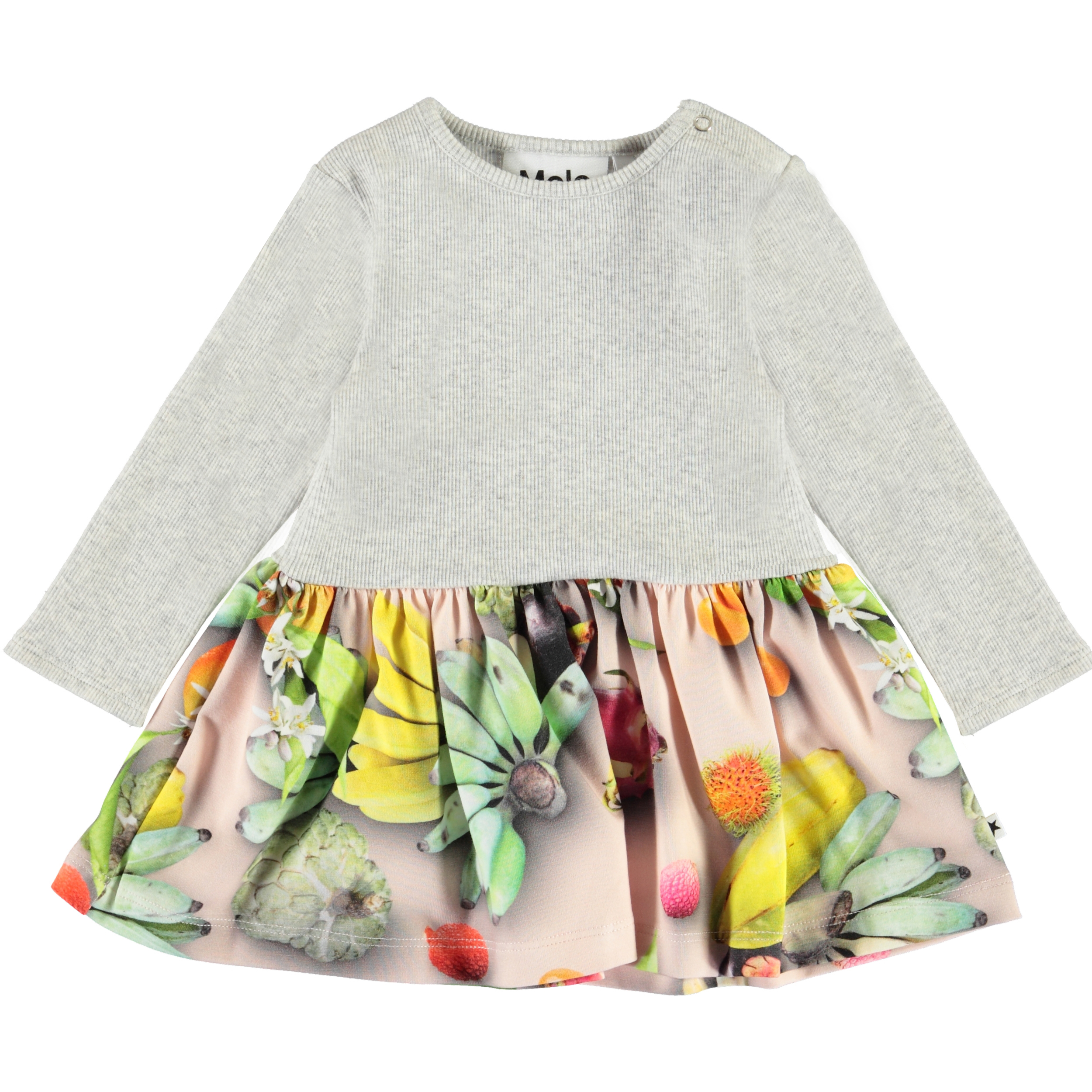 Carel is a long sleeve baby dress in a two-part look. The top is in a grey rib, and the skirt is decorated with tropical fruit.