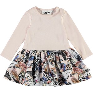 Carel is a baby dress in two parts with long sleeves. The top is in rose rib, while the skirt is in a print of various animals.