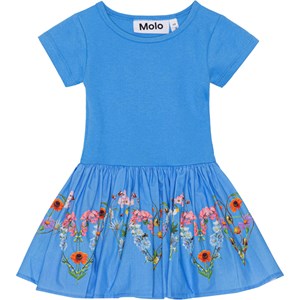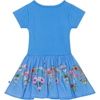 Blue, organic dress, with a printed skirt, for small children. The print is of various colourful flowers that form both hearts and clovers. The dress has a round neck, short sleeves and a round skirt.