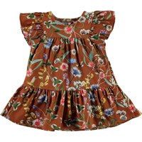 Carolle is a baby dress in brown with a print of wild flowers. The dress has ruffles on the shoulders.