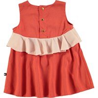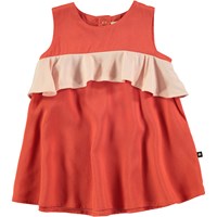 Lovely red sleeveless dress with a pink ruffle edge across the chest and back. It has an easy snap closure at the neck.