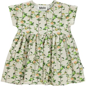 Channi is a cream and green, short sleeve baby dress in 100% organic cotton jersey. The dress is in a loose fit with a high waist and an airy skirt. Channi has an easy snap closure on both shoulders. It's in the all over Apples Mini print, with a bunch of apple tree branches filled with apples.