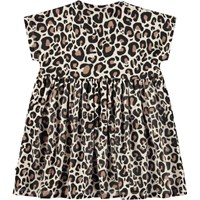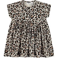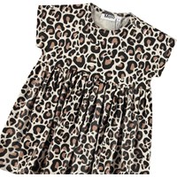 Jaguar print dress in organic cotton for the little ones. The dress features a round neckline, a skirt with good volume, high waist, and button closure at the neck.