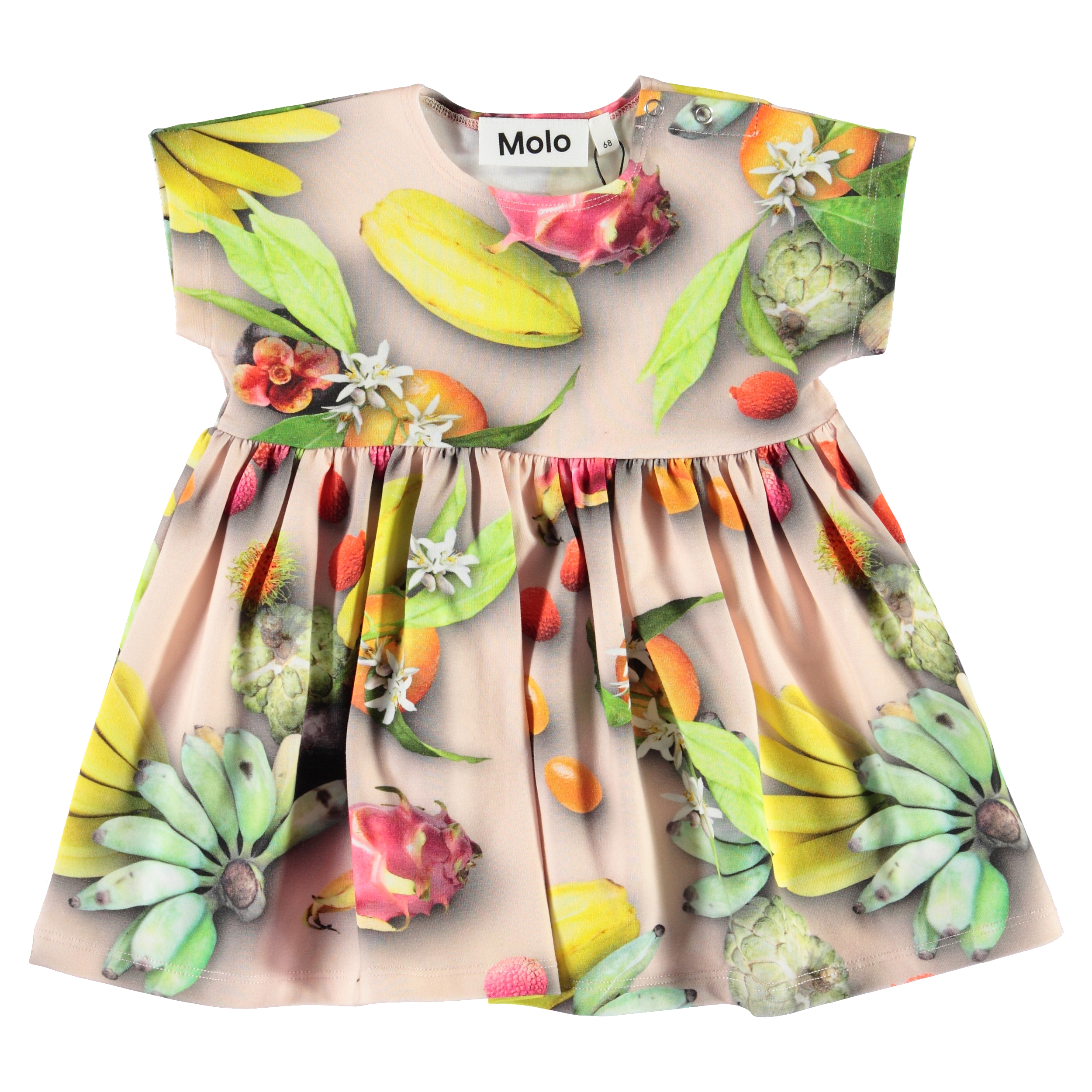 Channi is a baby dress in a tropical fruit print. Channi has a wide fit and an easy snap closure at the shoulders.
