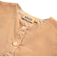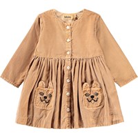 Light brown dress for the little ones made of soft organic cotton velvet. The dress has a loose fit and a wide skirt with volume. The dress has a nice button closure and two small pockets at the front, shaped like small dogs.
