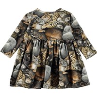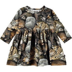 Charmaine is a baby dress with a print of various hibernating aninals. The dress has long sleeves and a full skirt.
