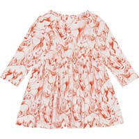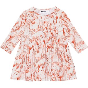 Organic dress, with a red print, for small children. The print is of red sketches of horses. It has a round neck, a snap closure, long sleeves and a circular skirt.