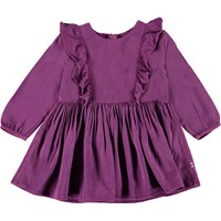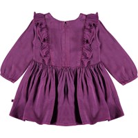 Chocho is a purple baby dress with long sleeves and a ruffle on the top. The dress has a zip closure at the neck.