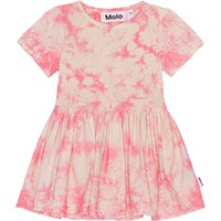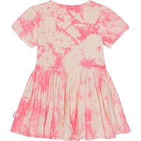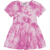Pink tie-dye dress for young children in organic cotton jersey. The dress has short sleeves with elastic, a round neck and a full skirt. It is in a loose fit and has an easy snap closure at the shoulders. Molo's tie-dye print is unique and made by hand, so the print may vary from style to style.
