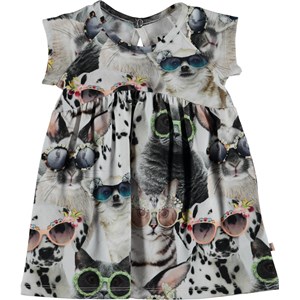 Short sleeve baby dress with an all over print of fun animals. It has an easy snap closure at the neck.