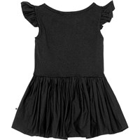 Black, organic dress for small children. The top of the dress has stretch to make it easy to move around in. The dress has a round neck, small sleeves and a circular skirt.