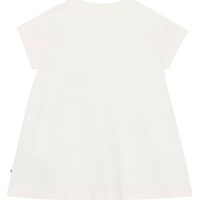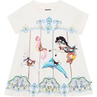 White t-shirt dress, with a print on the front, for small children. The print is of a imaginative carrousel.