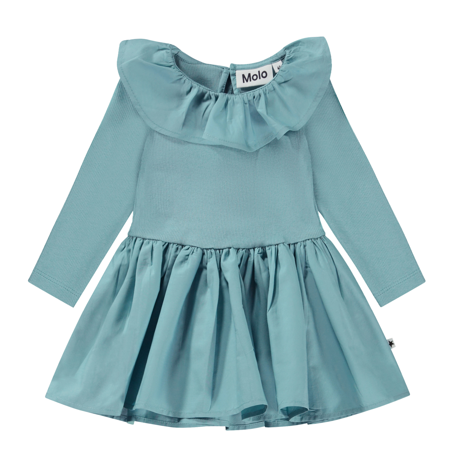 Light blue, long sleeve baby dress in 100% organic cotton. It has a sweet, round collar and a skirt, both in poplin. The dress has an easy snap closure at the neck.