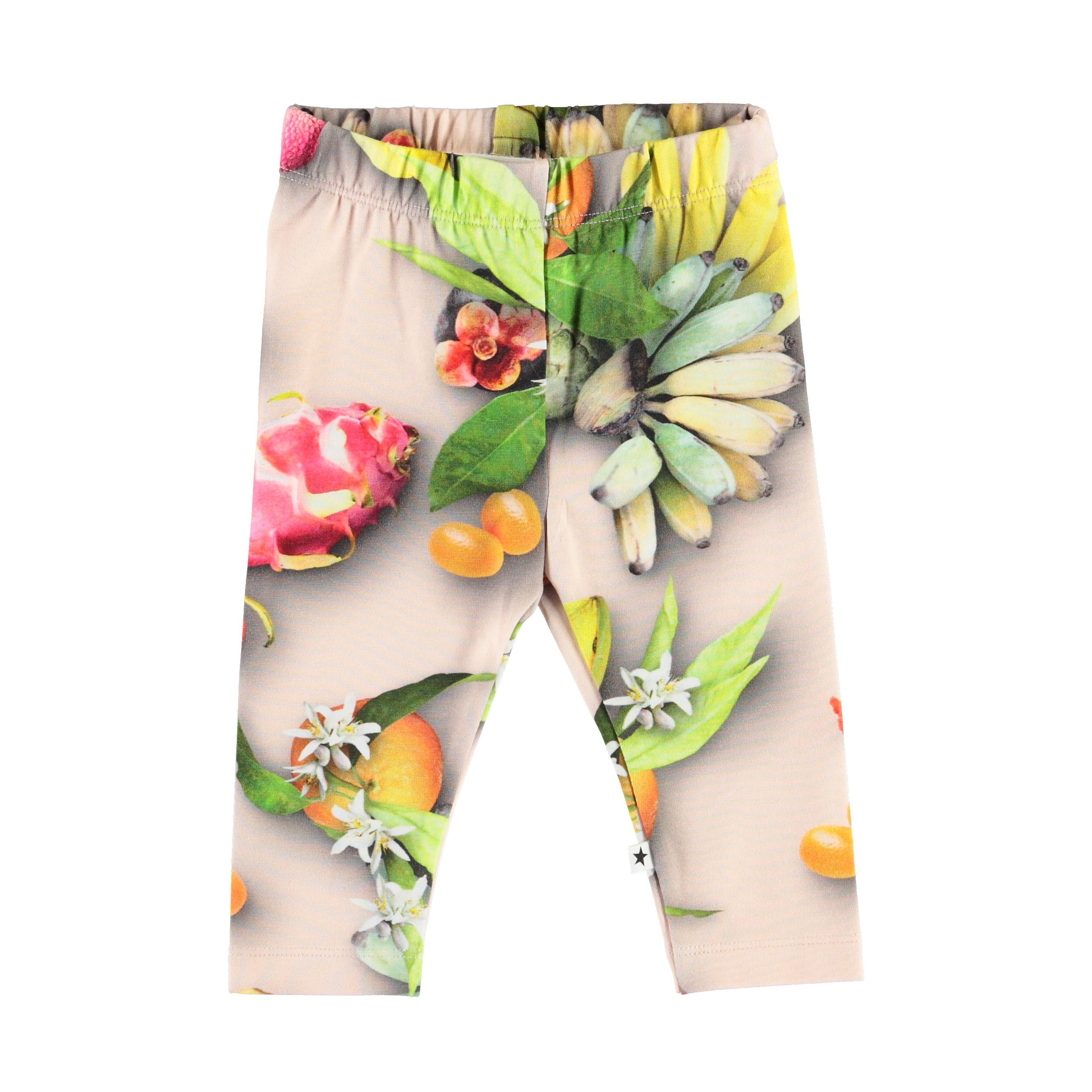 Stefanie is a pair of baby leggings with a tropical fruit print. The elastic waist and soft fabric ensure a good fit.