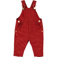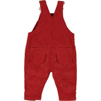 Sadie is a pair of red corduroy baby dungarees. They have a button closure at the sides and adjustable straps.