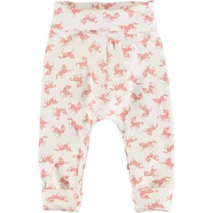 San is a pair of soft, white baby trousers with a rose coloured horse print. They have a wide, folded elastic at the waist and legs. Wear them with a matching top.