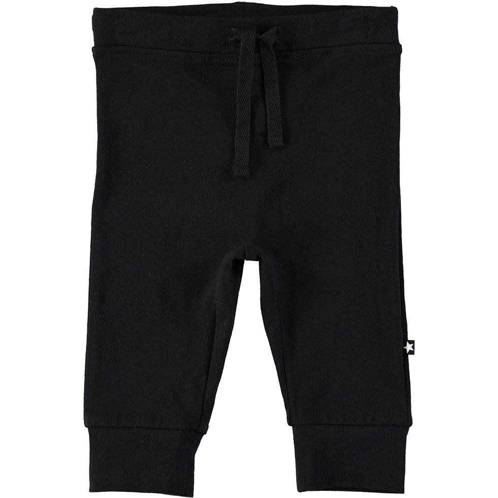 Soft, black baby trousers with a delicate embroidered star on the back. They have an elastic waist with ties to ensure a good fit.