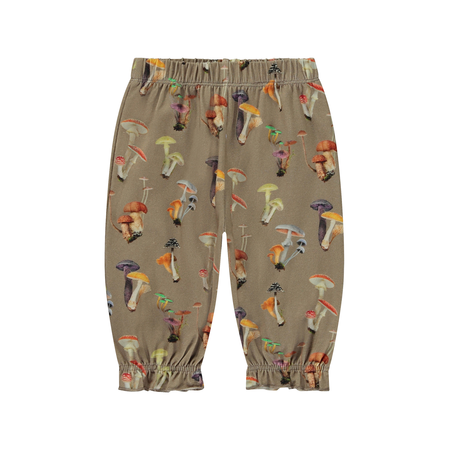 Beige baby trousers with mushroom print. They have elastic at the waist and legs with a gathered effect.