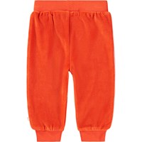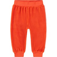 Red pants made of organic velour with orange. The pants have elastic ribbed edges around the waist and ankles and white piping along the legs.