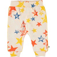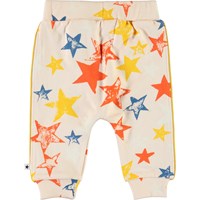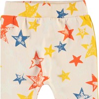 Shona is a pair of baby sweatpants with a colourful star print. They have elastic at the waist and the legs.