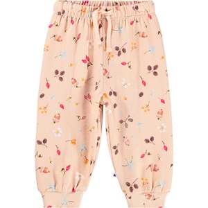 Soft pants for the little ones made of organic cotton. The pants are pink with a print of nuts, flowers and berries. The pants have elastic and a drawstring around the waist and ribbed cuffs around the legs. They are easy to take off and put on and provide plenty of freedom to move.