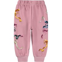 Soft pants for the little ones made of organic cotton. The pants are dark pink with a print of colorful ribbons and bows. The pants have elastic and drawstrings around the waist and ribbed cuffs around the legs. They are easy to take off and put on and provide plenty of freedom to move.