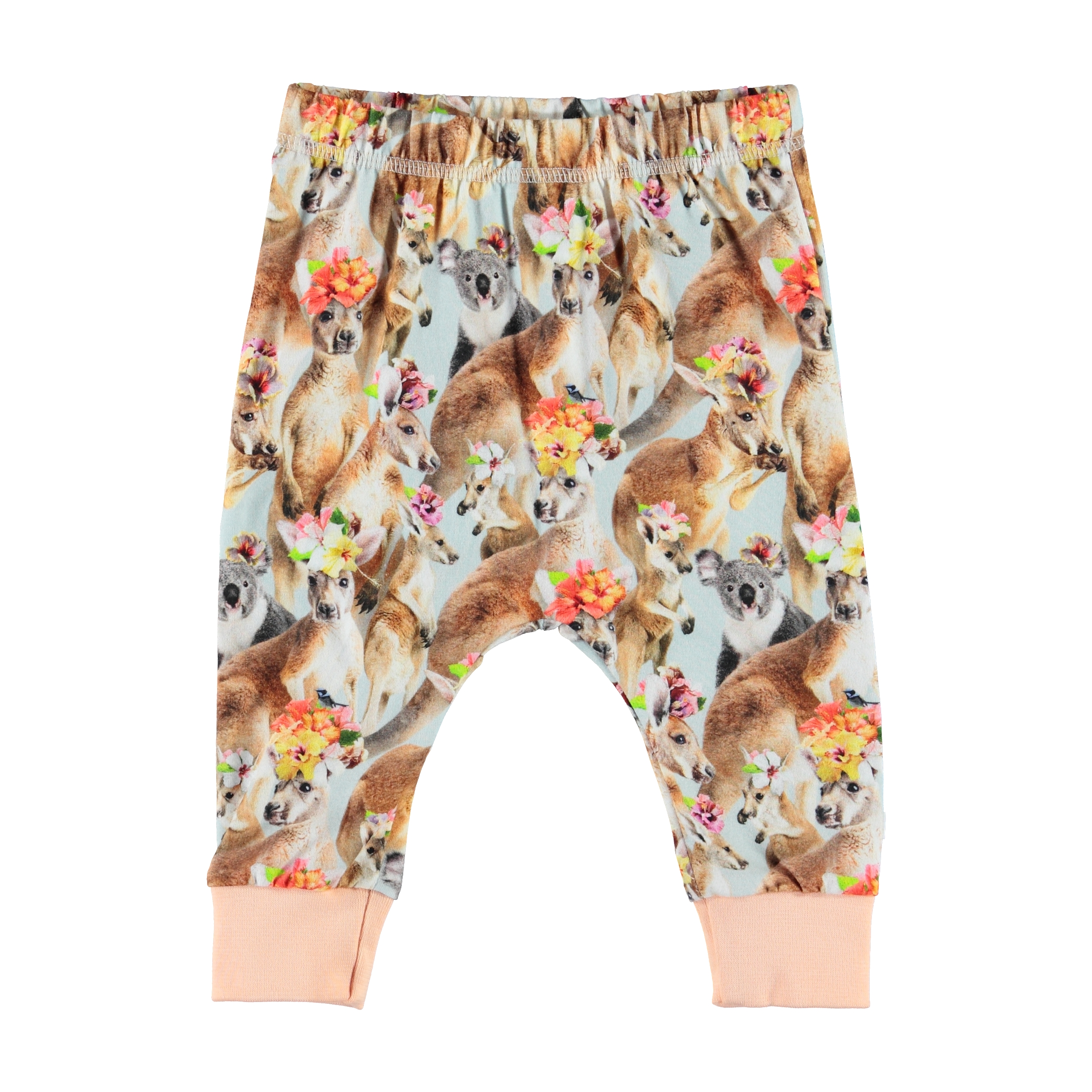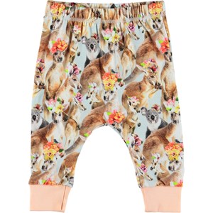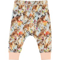 Simone is a pair of roomy baby trousers with a print of kangaroos and koala bears with flowers on their heads. Simone has an eleastic waist and rib at the legs to ensure a good fit.
