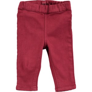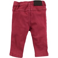 Cool baby denim jeggings in red with an elastic waist and a leather patch on one side.