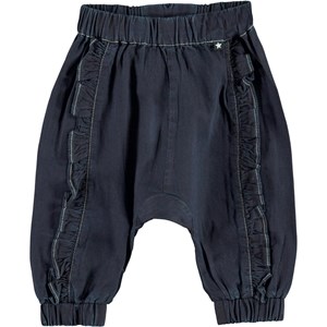Sophia is a pair of dark blue denim baby trousers with in a roomy fit and a ruffle edge at the front. They have an elastic waist to ensure a good fit.