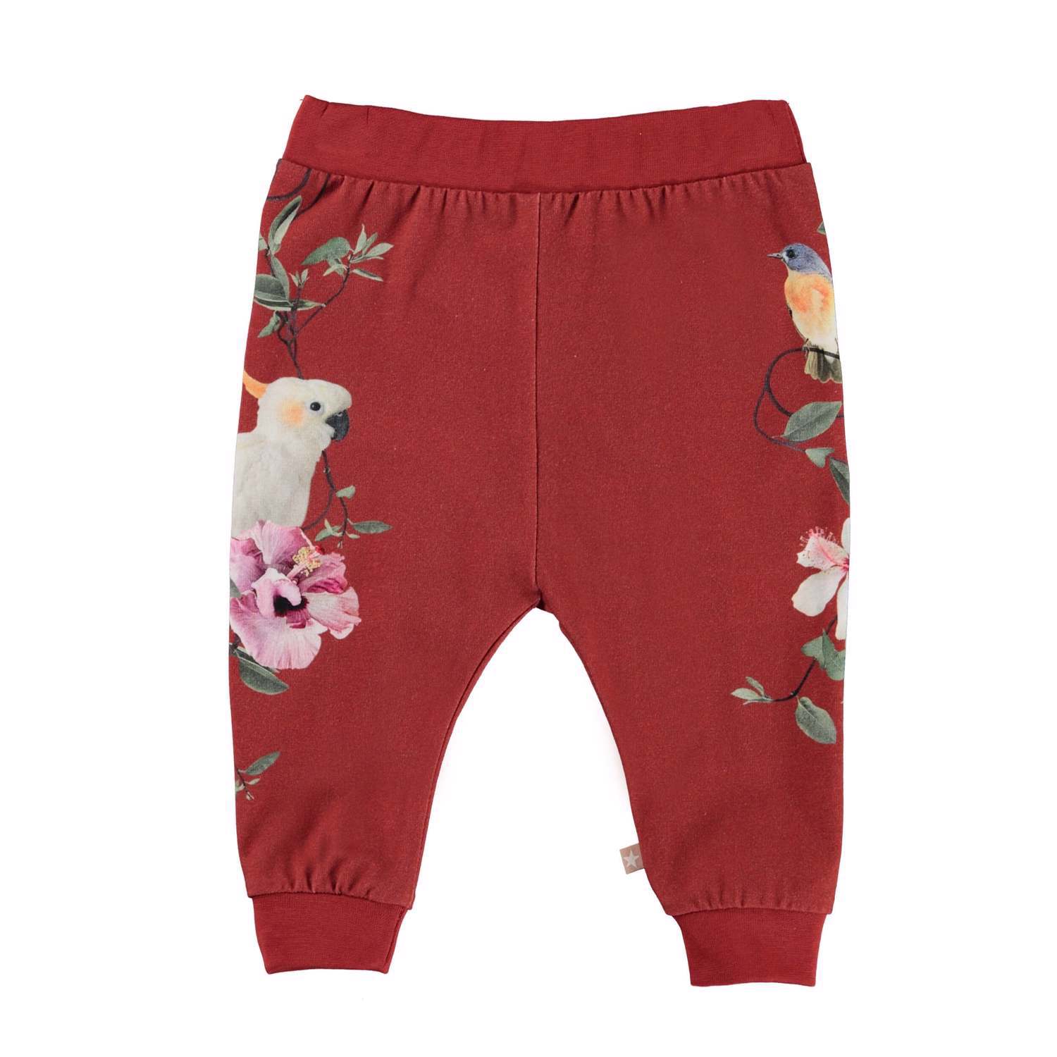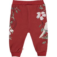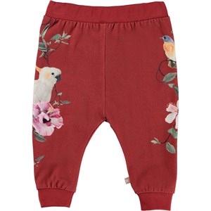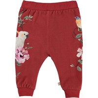 Susanne is a pair of roomy, red baby trousers in a print of a cockatoo, birds and flowers on the sides of the legs. Wear them with a matching top. Susanne has an elastic waist and rib at the legs for a really comfortable fit.