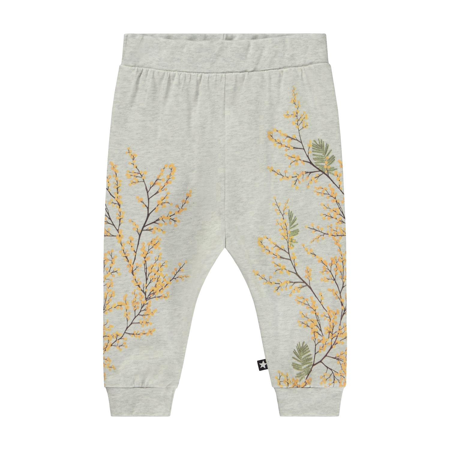 Light grey baby trousers with a print of branches on the sides of the legs. They have elastic at the waist and legs.