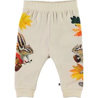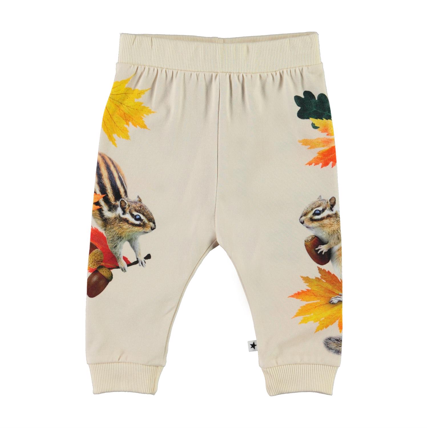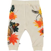 Susanne is a pair of roomy, light coloured baby trousers with a print of squirrels and nuts at the sides of the legs. Susanne has an elastic waist and rib at the legs to ensure a comfortable fit.