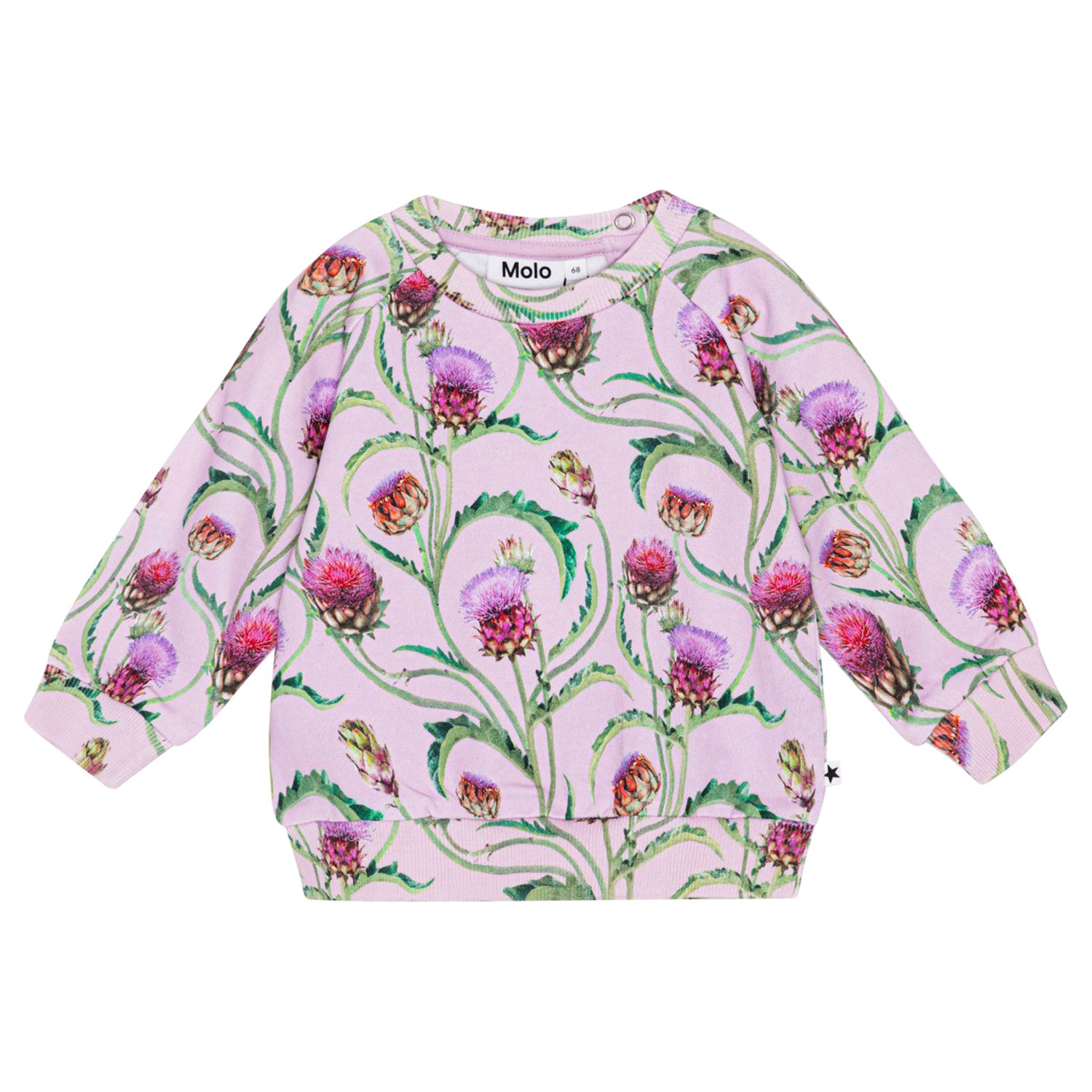 Light purple jumper for small children in organic cotton jersey. The jumper has rib at the bottom and at the sleeves and a round neck with an easy, two snap closure. It is in an all over print of beautiful artichoke flowers in shades of purple, red and green. Wear the jumper with matching trousers for a complete jersey set.