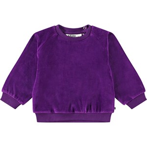 Purple sweatshirt for the little ones in organic cotton velour with a brushed inner face, making it soft and warm to wear. The sweatshirt has raglan sleeves, ribbed hem and sleeves, and a round neckline with two poppers at the back, making it easy to put on and take off.