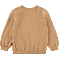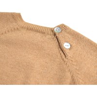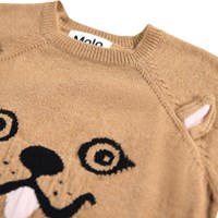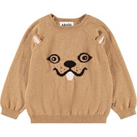 Knitted sweater for the little ones made of a wool and cotton blend. The sweater has a woven Pomeranian dog face with attached ears on the front, as well as raglan sleeves. The sweater has ribbed edges around the neck, sleeves, and waist. Combine it with the matching pants for a complete set.