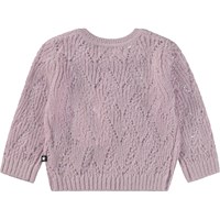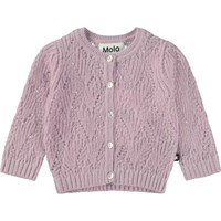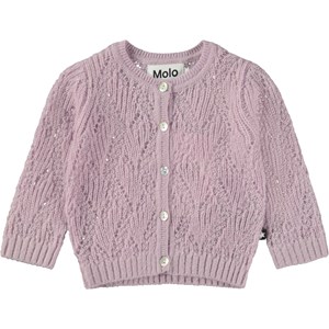 Knit baby cardigan in light purple. The cardigan is in a lovely hole pattern and has a button front closure.