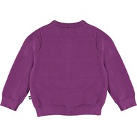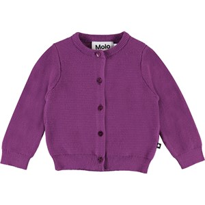 Ginny is a purple cotton cardigan for young kids. It has buttons down the front and rib at the neck, sleeves and bottom.