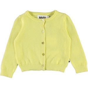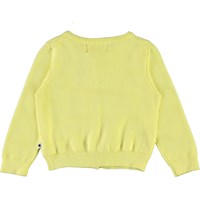 Ginny is a long sleeve, knit, yellow baby cardigan with a lovely needle-out pattern. Ginny has mother of pearl buttons down the front and rib at the neck, sleeves and bottom.