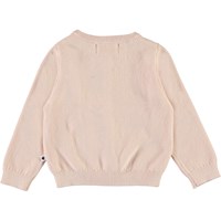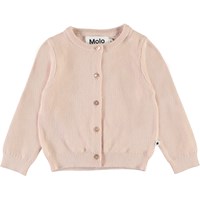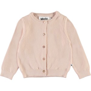 Ginny is a long sleeve, knit, rose coloured baby cardigan. Ginny has mother of pearl coloured buttons down the front. It has rib at the neck, sleeves and bottom.