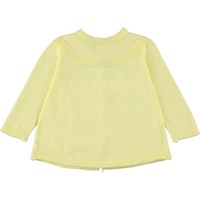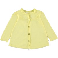 Gisela is in a fine knit, yellow cotton cardigan for small children. It has a lovely bell shape and delicate mother of pearl buttons down the front.