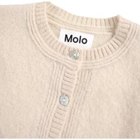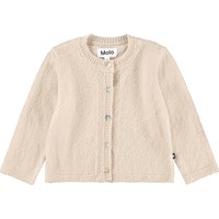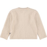 Beige knitted cardigan for the little ones made of wool. The cardigan has a loose fit, mother-of-pearl buttons on the front and knitted ribbed edges around the neck, sleeves and waist. Combine it with the matching pants for a complete set.