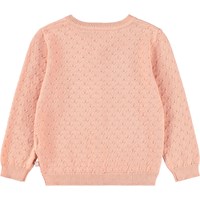 Rose knitted cardigan for the little ones made of organic cotton. The cardigan is knitted in a floral pattern, has a round neckline, ribbed edges and mother-of-pearl buttons down the front.