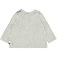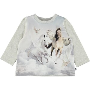 Ebby is a grey baby top with a flying horse print on the front. Ebby has light grey sleeves and back.