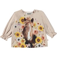 Rose coloured baby top with a print of a horse surrounded by beautiful flowers on the front. The top has sweet sleeves with elastic at the wrists and a snap closure on the shoulder.