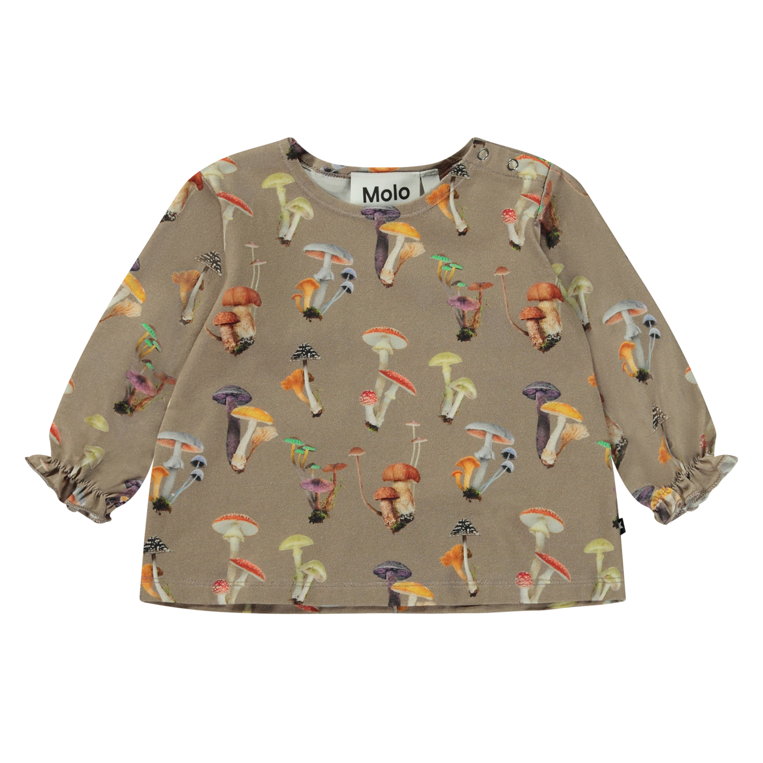 Beige baby top with a print of various mushrooms. The top has sweet sleeves with elastic at the wrists and a snap closure on the shoulder.