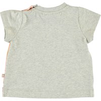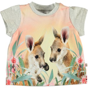 Elly is a grey baby t-shirt with a baby kangaroo print on the front. The t-shirt has an easy single snap closure on the shoulder.